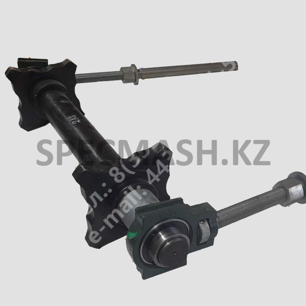 Вал натяжной МД-6.5 02.02.800 в сборе. Общая длина вала 850 мм, расстояние по центрам звездочек — 505 мм, длина натяжного винта с подшипником — 715 мм, длина резьбовой части — 185 мм, диаметр винта — 33 мм.